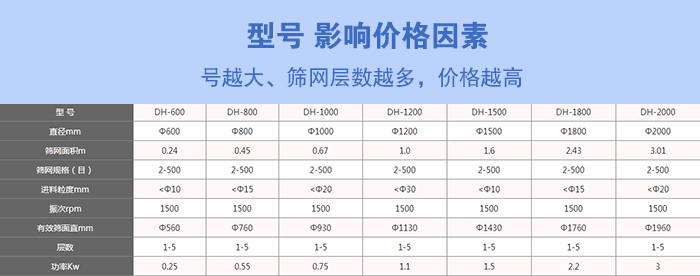 葵花籽不銹鋼振動篩型號有DH400型、DH600型、DH800型、DH1000型、DH1200型、DH1500型、DH1800型、DH2000型。不同大小的型號所配備篩網(wǎng)層數(shù)也不同(可達(dá)到五層),型號越大篩網(wǎng)層數(shù)越多價格越高。