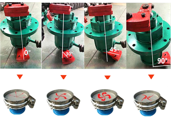 2、當(dāng)你想讓篩面上的物料迅速向四周擴(kuò)散或是加快擴(kuò)散時(shí),需要把旋振篩的電機(jī)夾角調(diào)小,比如調(diào)到30度,或是20度,或是更小,角度越小物料向四周擴(kuò)散的越快,反之就會(huì)越慢,當(dāng)角度達(dá)到90度時(shí),物料就會(huì)向篩面中心集中。